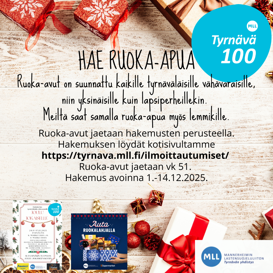 Hakemuslomake Jouluruoka-apuun vuonna 2025 aukeaa 1.12.2025 klo 7.00. Hakemukset käsitellään, kun hakuaika on päättynyt (14.12.2025). Avustus on tarkoitettu kaikille vähävaraisille tyrnäväläisille!
