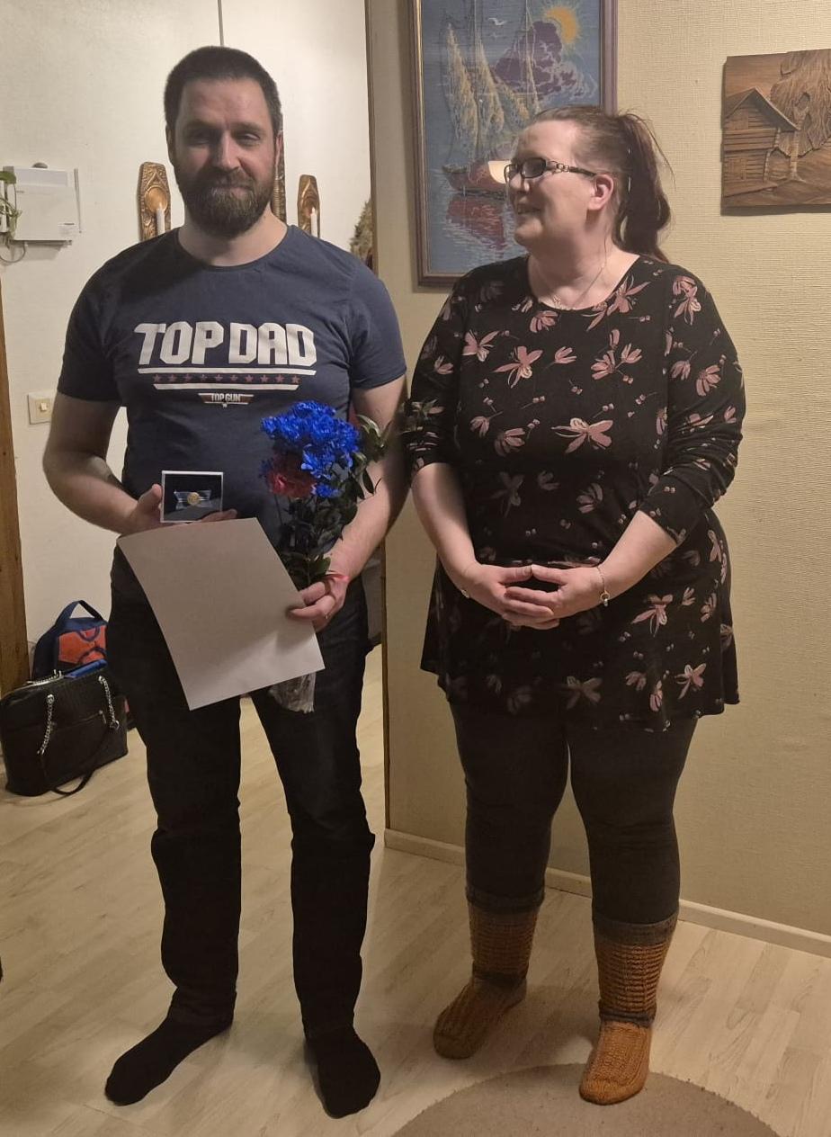 MLL Tyrnävän yhdistyksen ylimääräisessä vuosikokouksessa 17.1.2026 luovutettiin pronssinen ansiomerkki vapaaehtois- tai luottamushenkilölle tunnustuksena pitkäaikaisesta, vähintään 5 vuotta kestäneestä työstä liiton, sen piirijärjestöjen ja / tai paikallisyhdistysten tai näiden hallinnoimien yhteisöjen hyväksi. Kuvassa vasemmalta paikallisyhdistyksen hallituksen jäsen Antti Suhonen ja oikealla hallituksen puheenjohtaja Sanna Suhonen